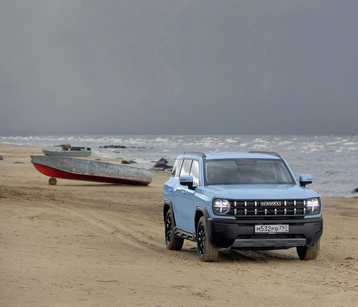 Фотографируя Haval H3 на берегу водохранилища, я про себя отметил, что кроссовер отлично смотрится в такой мизансцене. И не только благодаря цвету кузова – почти azure, как сказали бы итальянцы, так отлично сочетающемуся и с водой, и со свежим после ливня небом. Нарочито прямые борта, как у моторных лодок, которые стоят на деревянных чурбаках вдоль берега водохранилища. Боковое остекление, делающее автомобиль чем-то похожим на катер с подводными крыльями, на которых доводилось кататься в том же детстве. Такое же дежавю и в салоне. Селектор переключения передач похож на рукоять, с помощью которой начальник турбазы на Селигере управлял мотором «Нептун», установленным на дюралевом катере «Прогресс». Круглые фары – это тоже такое ретро, привет самым первым внедорожникам, как бы они ни назывались – Jeep Willys или ГАЗ-63. Немного смущают кресты на задних фонарях, но будем считать, что это не кладбищенская тема, а гюйсы, сигнальные флаги. Белый с красным крестик – это буква П. Ну, и еще эта странная выпуклость на пятой двери. Запасного колеса в ней нет, как у Jetour T2, представители, правда, находят оправдание этому явно декоративному элементу в том, что благодаря ему не пачкается заднее стекло и потому стало возможным не оснащать его дворником. Хотя справедливости ради надо сказать, что в это окно и так ничего не видно – слишком узкое.