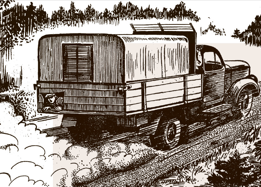 Художник реконструирует события, иногда имитируя силой своего воображения гигантский рентгеновский аппарат: он выявляет все, что скрыто. Это может быть и фальшстенка в продуктовом автофургоне; и укрытие, оборудованное на уровне выгребной ямы мест общественного пользования; и топливный бак грузовика, в котором, согнувшись в три погибели, притаился беглец.