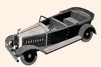 Одно из самых ранних подобных изданий – «Давайте склеивать. Альбом игрушек из бумаги» – выпущено в Москве в 1925 году. Это обычный альбом формата А4 с напечатанными на листах раскройками, которые требовалось вырезать, согнуть и склеить. Издание было периодическим, но только в восьмом номере детям предлагалось склеить автомобиль, причем наряду с пароходом, самолетом и осликом, запряженным в повозку.