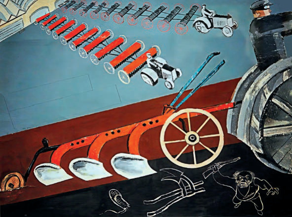 Железный конь идет на смену крестьянской лошадке. Но почему-то в роли «железного коня» – какой-то иностранный гусеничный трактор, а не советский «Сталинец». На заднем плане Кукрыниксы нарисовали вышку ЛЭП, попутно намекнув и на электрификацию всей страны.