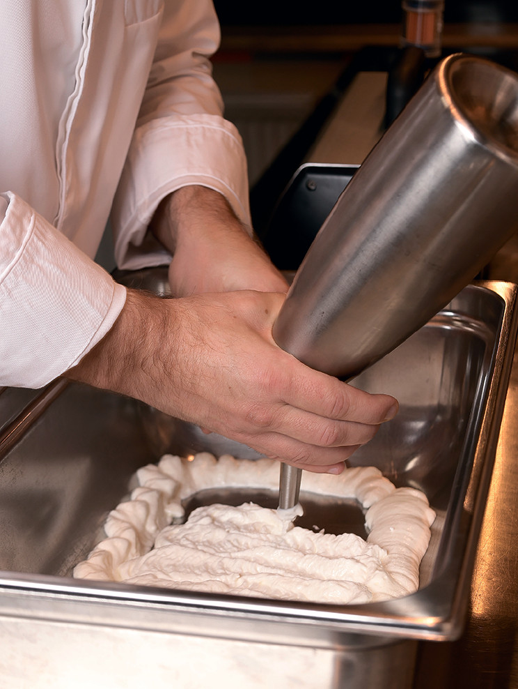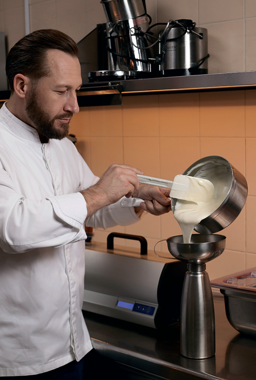 С помощью этого аппарата мы готовим пористый шоколад и пористое мороженое, рецептом которого я решил поделиться с коллегами.