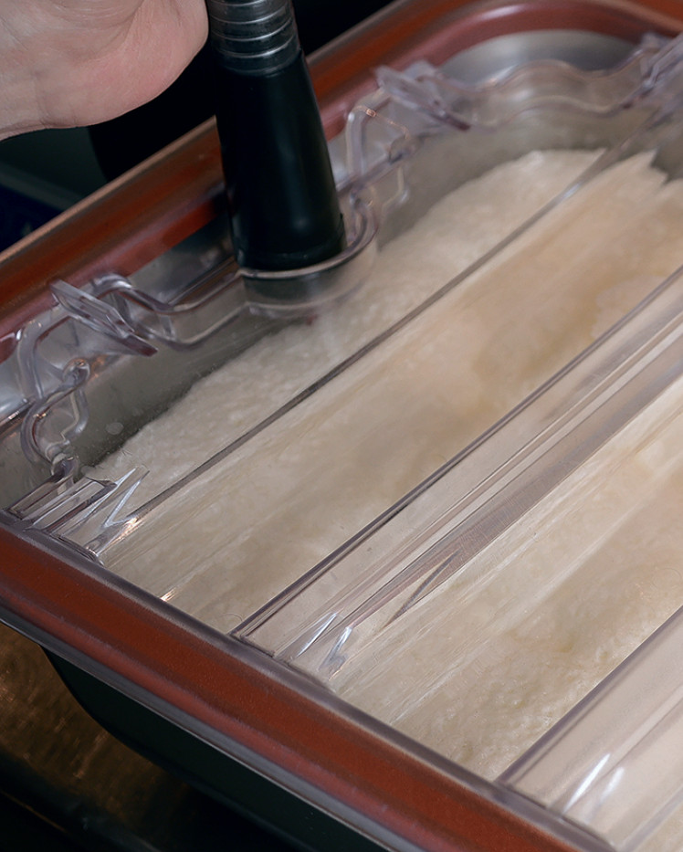 Кроме того, вакуумная пропитка ускоряет процесс впитывания маринадов, уксусов, соли, специй, мясного сока, бульона и т.д. При этом текстура продукта не нарушается, поскольку вакуумирование проходит поэтапно, а уровень вакуума регулируется автоматически.