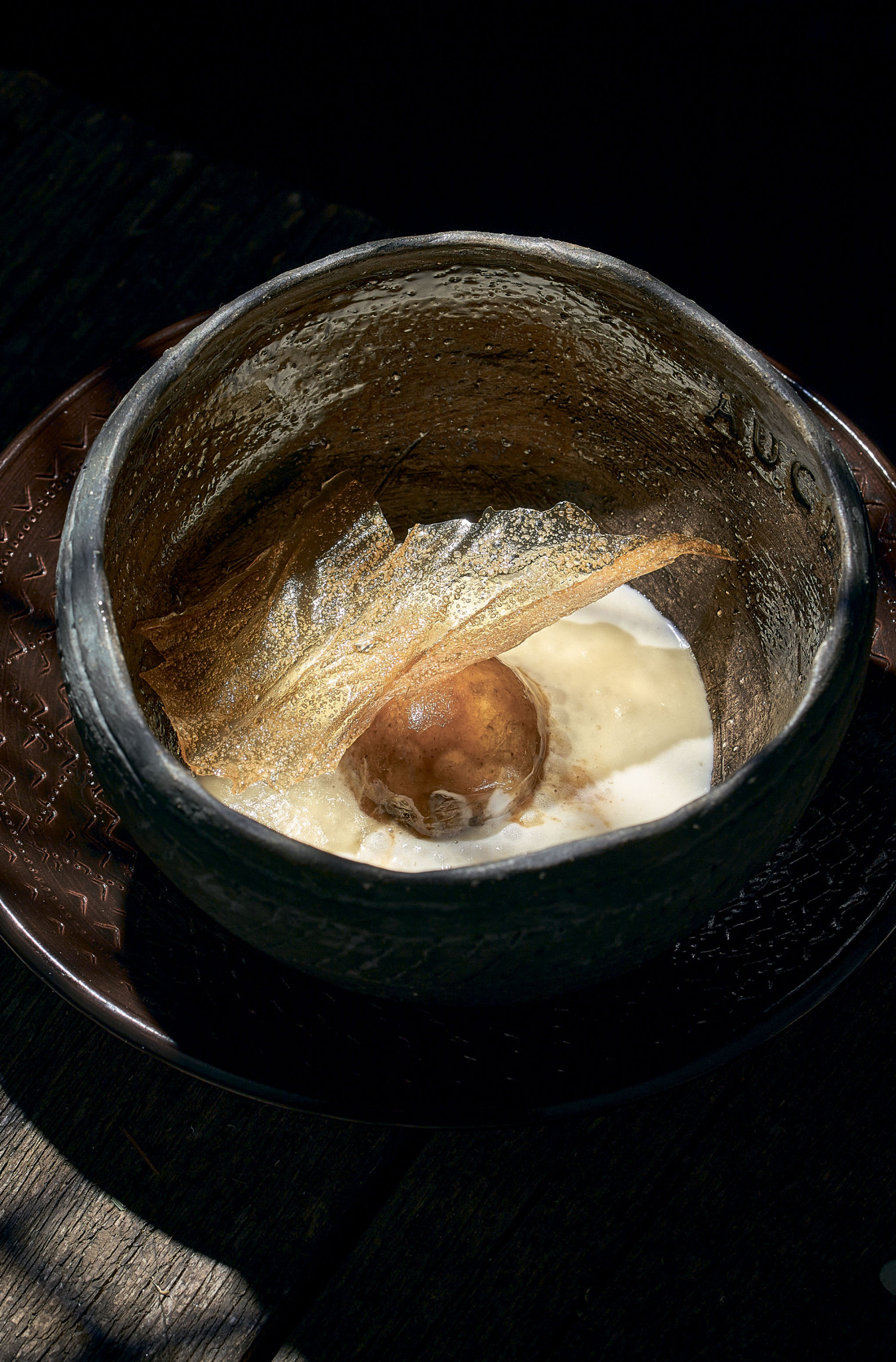 Картофель прогреть в соусе из картофельного сока 2 минуты. Соус вылить в центр глубокой тарелки, выложить картофель, полить глазурью из кожуры и посолить. Вокруг отцедить горячий картофельный мусс и накрыть хрустящим чипсом из картофеля.