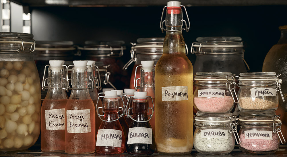 Уксус и побеги смешать в пакете, запечатать под вакуумом и выдерживать 24–48 часов при комнатной температуре. Процедить и хранить в плотно закрытых бутылках.