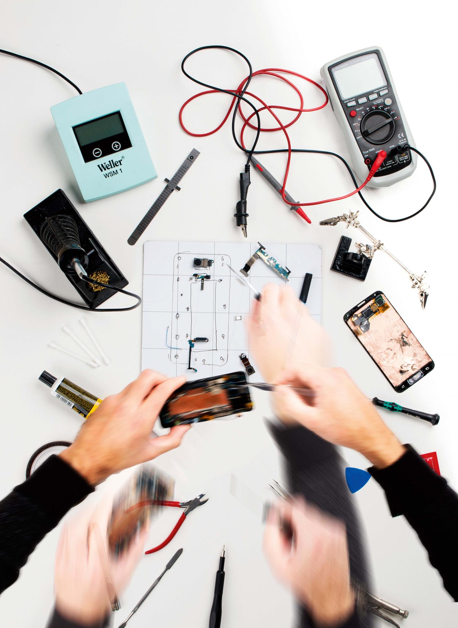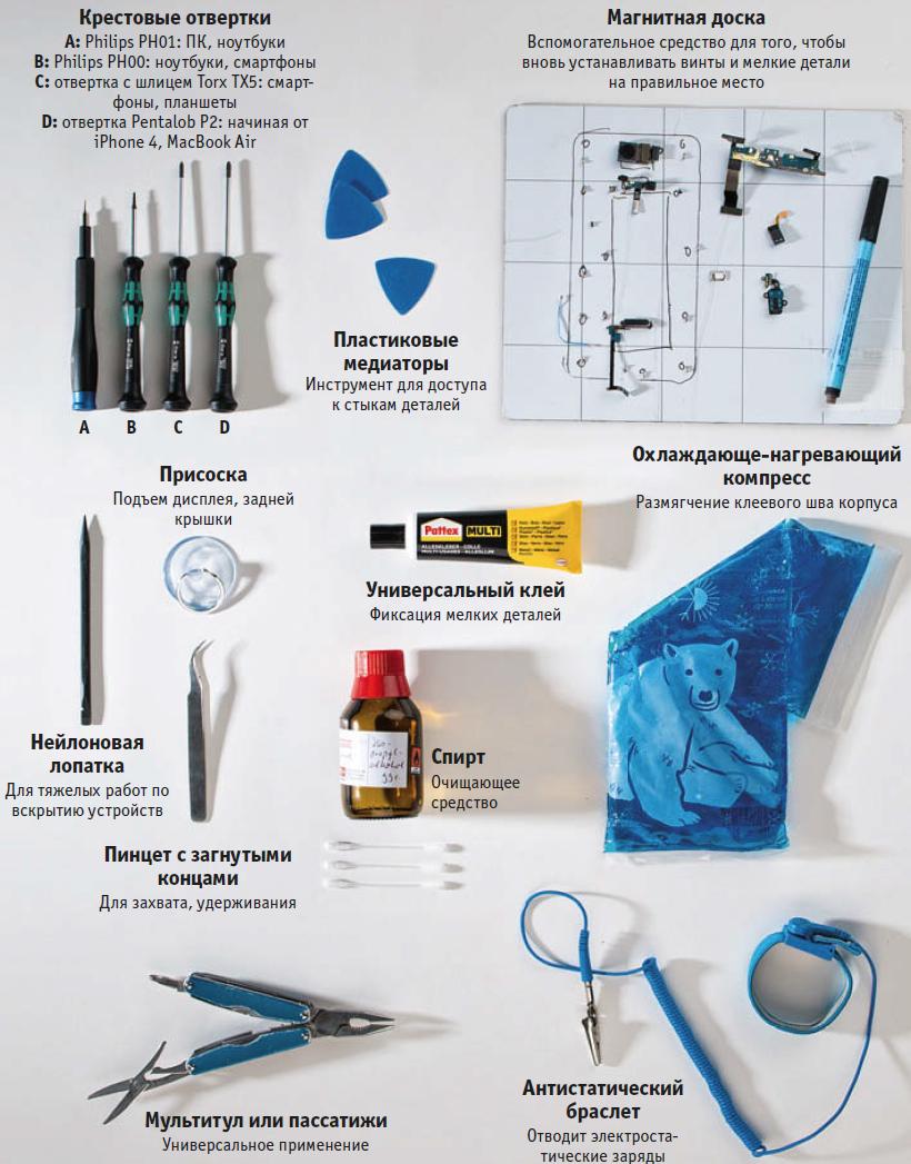 Если вы получили удовольствие от ремонта, стоит задуматься о дальнейших приобретениях. Блестящий хром слепит глаза, поэтому не связывайтесь со сверкающими инструментами в корзинах магазинов уцененных товаров. Разумеется, существуют исключения, но, как правило, хороший инструмент стоит довольно дорого. Добротную отвертку вы, например, сможете определить по ее матово-черному вороненому шлицу и хорошо зачищенной от неровностей рукоятке. Кроме того, комбинация из твердой и мягкой пластмассы обеспечивает хорошее сцепление с кожей ладони. В качестве базового оборудования мы рекомендуем набор отверток со шлицами PH0, PH00, Torx 5, а также очень тонкую плоскую отвертку с шириной шлица 1,2 мм. Тем, кто чинит технику Apple, дополнительно понадобится специальные отвертки Pentalob P2 для iPhone и Pentalob P5 для MacBook. При захвате, прижиме, изгибе помогут маленькие пассатижи (или мультитул), а также несколько пинцетов с закаленными и по-разному изогнутыми кончиками. При вскрытии корпусов смартфонов и отключении плоских кабельных соединений хорошо зарекомендовали себя медиаторы для гитар. Более грубые работы по подъему деталей выполняются нейлоновым шпателем (лопаткой) с плоским и острым концом, который, с одной стороны, достаточно прочен, чтобы передавать усилие в требуемом направлении, а с другой — не царапает легко повреждаемые поверхности и не проводит ток.