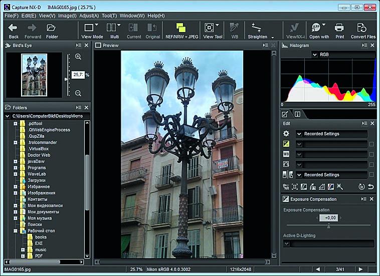 Бесплатный пакет от Nikon для обработки фотографий в RAW-форматах. Программа покажет гистограмму, все свойства и настройки изображения, позволит изменить их, сравнить несколько вариантов картинки и моментально увидеть результаты изменений настроек, а также при необходимости «откатить» изображение в исходное состояние. Capture NX-D позволяет выгружать и сохранять информацию о настройках в виде отдельного файла.