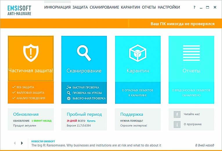 Антивирусный сканер от известного разработчика, который проверит систему на наличие вредоносных объектов, изолирует зловредов в карантине и предоставит пользователю отчет о проделанной работе. Для более надежных результатов сканер работает с двумя антивирусными движками параллельно, но при этом не «съедает» все доступные системные ресурсы. Помимо сканера в Emsisoft Anti-Malware есть и средства проактивной защиты ПК от заражения. Умеет программа и блокировать попытки загрузок вредоносных сайтов.
