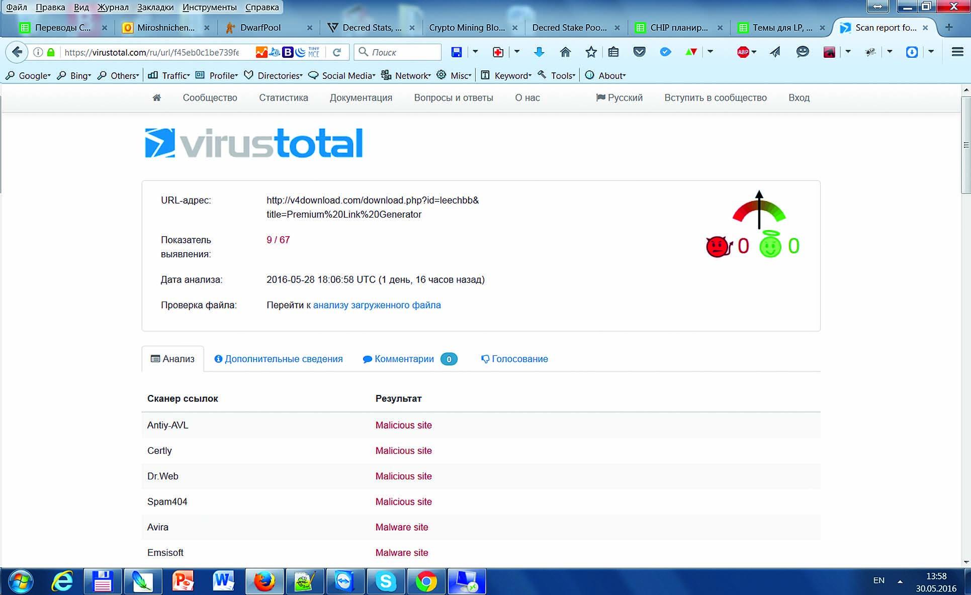 Проверка на virustotal.com показывает, что файл содержит вредоносное ПО.