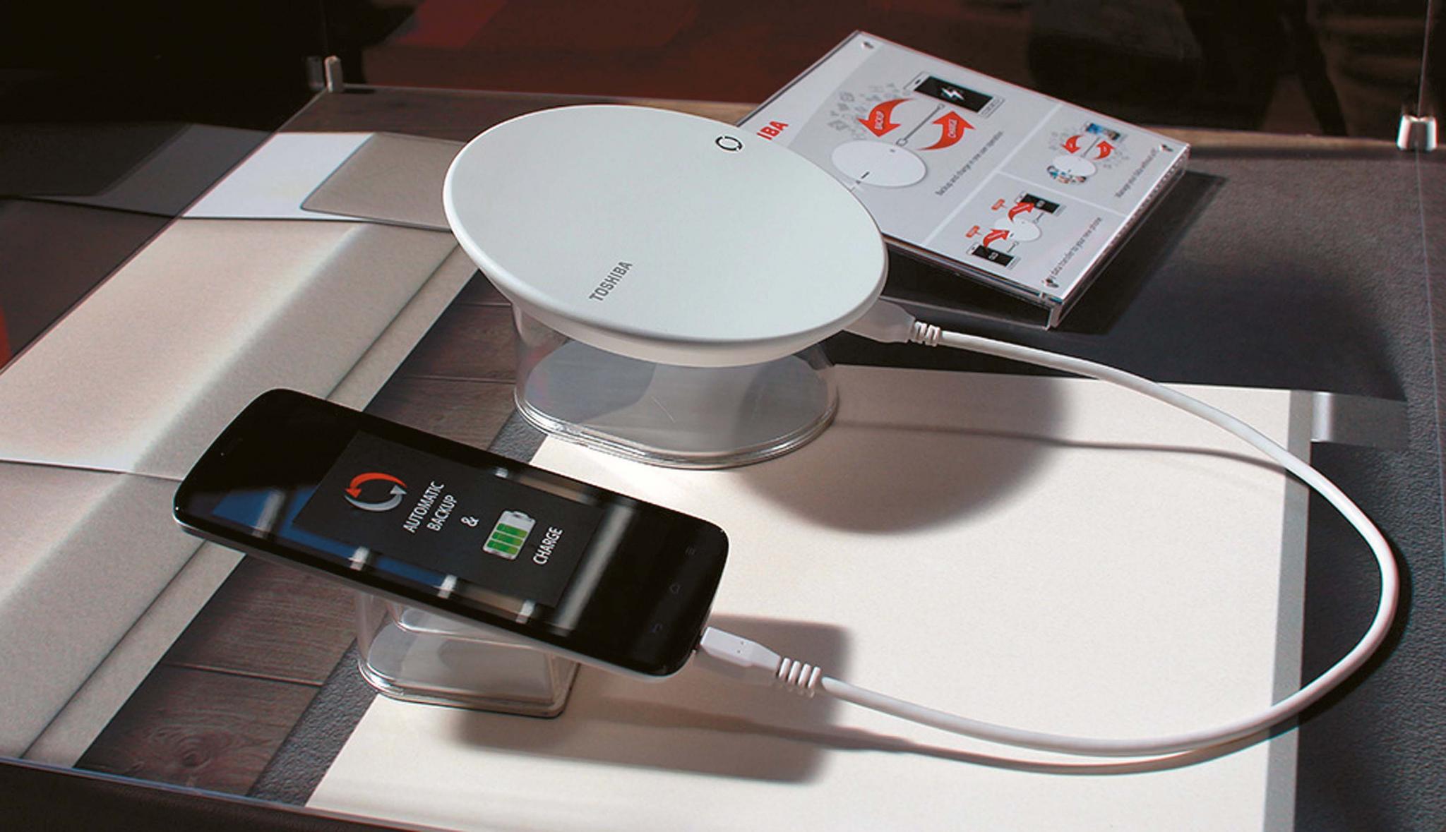 На выставке потребительской электронике IFA 2016 компания Toshiba воплотила эту мечту в реальность, представив прототип устройства с подобными функциональными возможностями. Чем же оно интересно? С виду новинка, у которой еще даже названия нет, представляет собой обычную круглую площадку с блоком питания, напоминающую индукционную панель для зарядки мобильных гаджетов. Смартфон традиционно подключается к устройству по USB-кабелю, после чего начинает заряжаться и производит сопряжение с внутренним хранилищем зарядной станции.