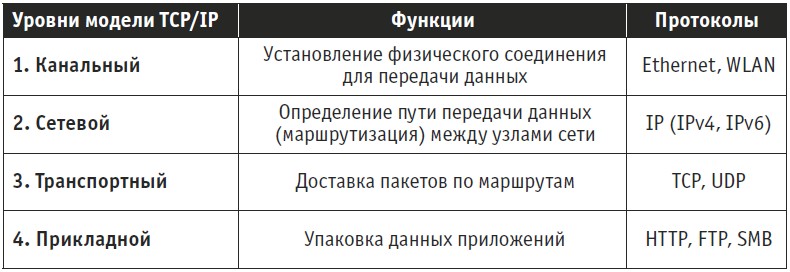 Обмен данными между разными устройствами, объединенными в домашнюю сеть по витой паре, беспроводной сети или с использованием Powerline, происходит между прикладным программным обеспечением и физической средой передачи в несколько промежуточных ступеней, или уровней в терминологии сетевых технологий. На каждом уровне тесно взаимодействуют определенные протоколы, по которым, в конечном счете, и происходит передача данных. В сетевой модели TCP/IP (см. таблицу справа вверху) первый уровень представлен витой парой или волнами беспроводной сети, устанавливающими пока только соединение между клиентским устройством и маршрутизатором в домашней сети. Второй уровень: маршрутизатор выдает клиентским устройствам IP-адреса, используемые для задач адресации. Домашнюю сеть образуют все устройства, которые находятся в одном диапазоне IP-адресов; первые числа — это 192.168, третье число определяет диапазон адресов (например, роутер — 178, в других случаях в основном 1), четвертое число — номер устройства в сети от 1 до 254.
