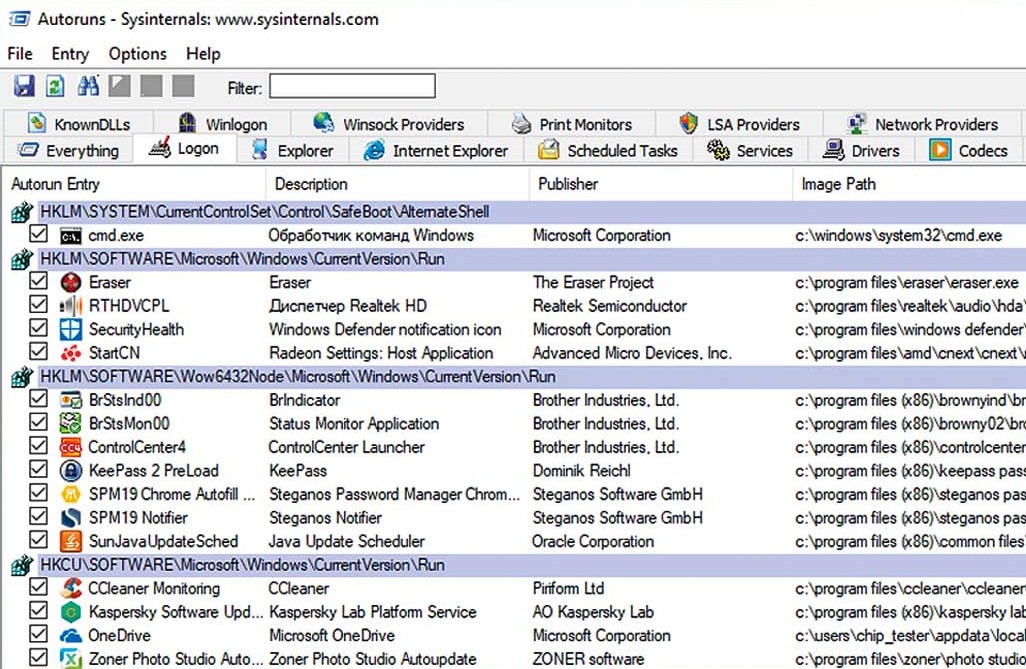 С течением времени все больше программ попадает в автозагрузку Windows, что в целом замедляет запуск ПК. Для простой очистки папки автозагрузки Microsoft предлагает бесплатный инструмент Autoruns (goo.gl/M9BZE7, есть на CHIP DVD). Распакуйте ZIP-архив в любую папку на вашем ПК, щелкните правой кнопкой мыши по файлу «Autoruns64.exe» и выберите «Запуск от имени администратора», чтобы запустить 64-разрядную версию. Если вы пользуетесь 32-разрядной Windows, вам понадобится файл «Autoruns».