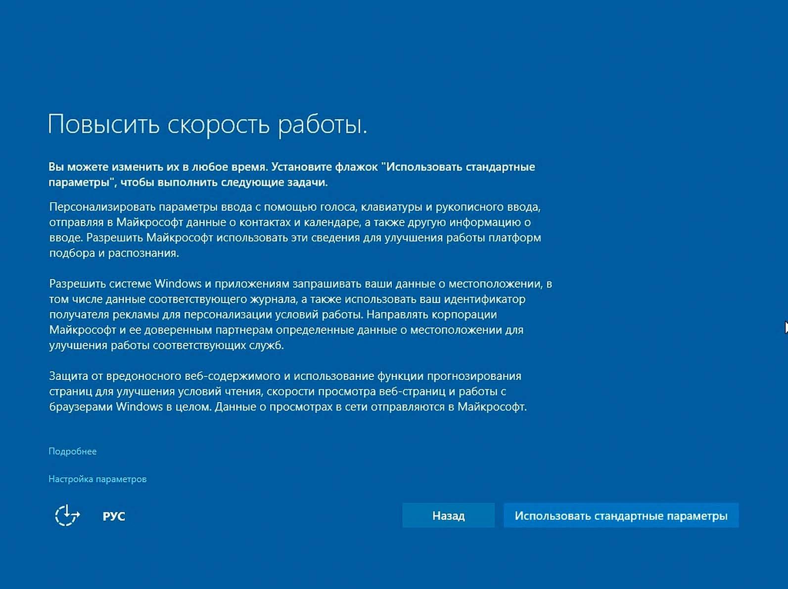 Windows 8 и 10 при установке заманивают опцией «Повысить скорость работы». Но будьте осторожны: при выборе «стандартных параметров» вы предоставляете ОС от Microsoft огромное количество прав доступа. Чтобы это предотвратить, на данном этапе в левом нижнем углу нажмите на ссылку «Настройка параметров» (Windows 10) или «Настройка» (Windows 8.1). Все опции переведите на положение «Отключено».