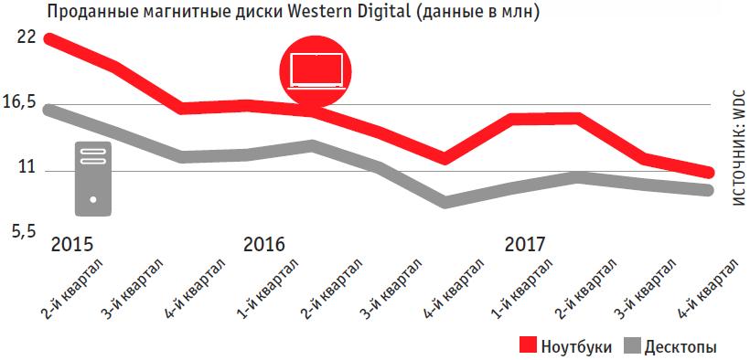 Тем не менее выступление на конференции специалистов в сфере технологий памяти вызвало вопрос: не истекает ли время магнитных дисков? В этом духе, например, выразился Керри Манс, отвечающий за разработку твердотельных накопителей в Micron. Показательно также, что два крупных производителя накопителей на жестких магнитных дисках — Western Digital и Seagate — уже несколько лет пытаются укрепиться на рынке твердотельных носителей. Недавно некий инвестиционный консорциум при участии Seagate и Hynix выкупил у Toshiba подразделение по производству чипов флеш-памяти, причем в ущерб Western Digital. Последняя до этого сотрудничала с Toshiba в разработке новой технологии флеш-памяти.