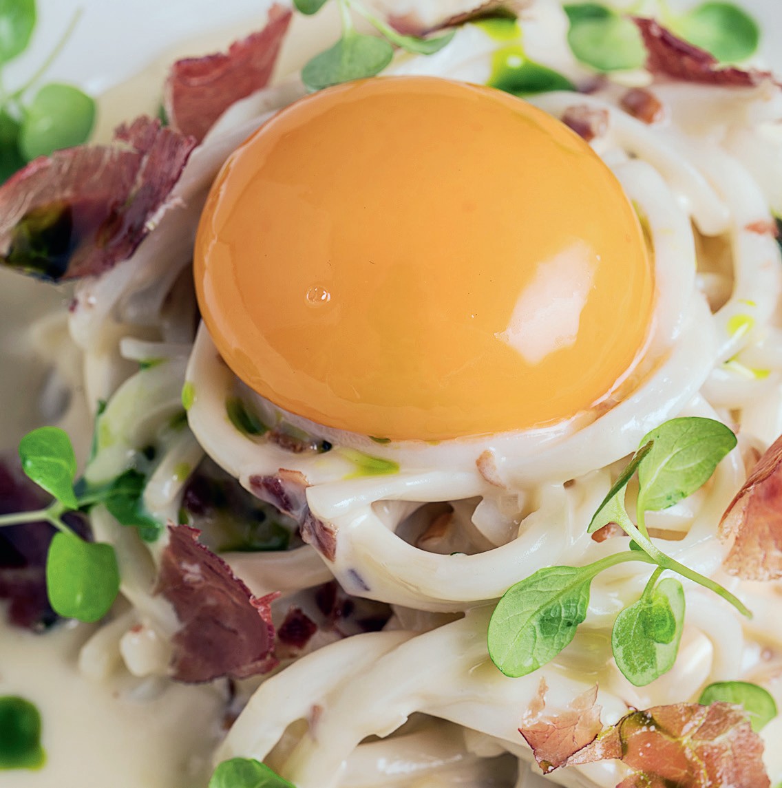Обработай тушку кальмара: разрежь ее вдоль, чтобы раскрыть, очисти от пленки, промой и просуши. Нарежь тонкими полосками во всю длину в виде домашней лапши. На растительном масле обжарь нарезанный кубиками лук-шалот, тимьян и чеснок. После того как приправы отдадут маслу свой аромат, достань их, влей коньяк и подожги. Как только огонь потухнет, то есть алкоголь выпарится, можешь добавлять сливки и пармезан. Соус необходимо слегка подержать на огне, чтобы он стал тягучим, и отставить в сторону. Теперь набери в небольшой сотейник воду и бланшируй лапшу из кальмара 3-5 минут, затем переложи ее в соус. Добавь соль и перец по вкусу. Выложи в тарелку готовую «пасту», укрась сырым желтком и кусочками хамона.