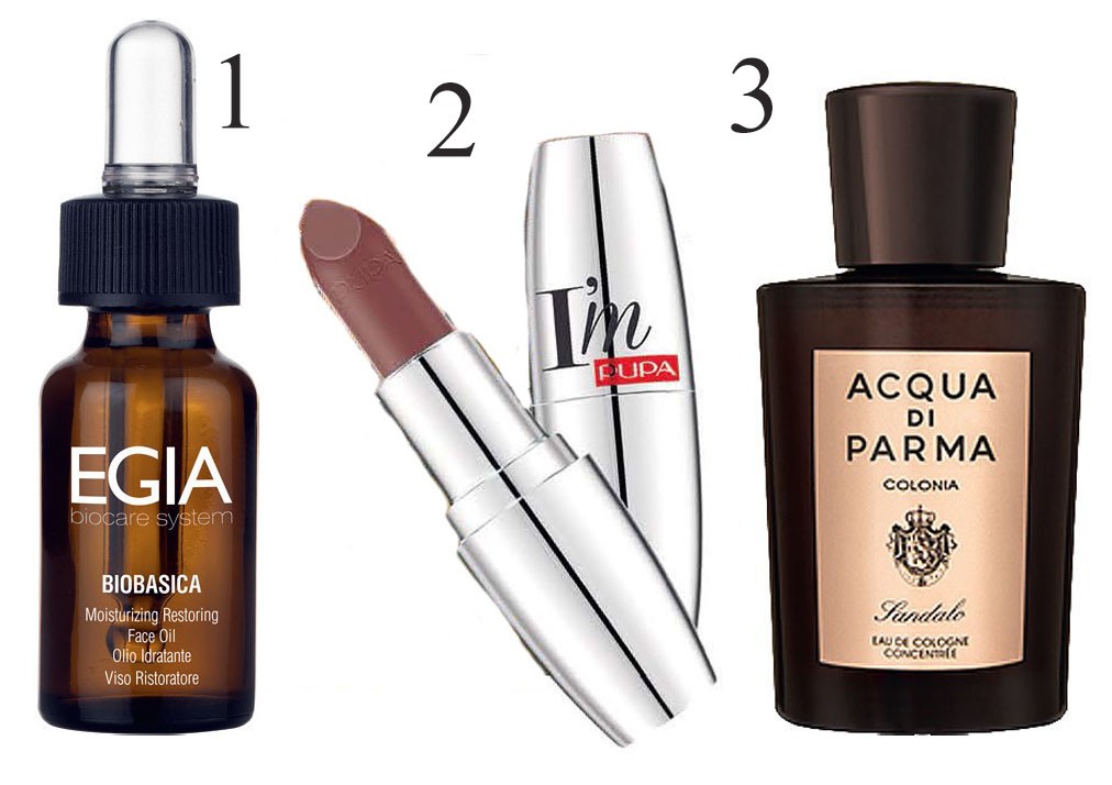 1. Масло Moisturizing Restoring Face Oil, Egia, 3300 руб. 2. Помада I’m Matt, Pupa, 739 руб. 3. Аромат Colonia Vaniglia, Acqua Di Parma, 18 990 руб