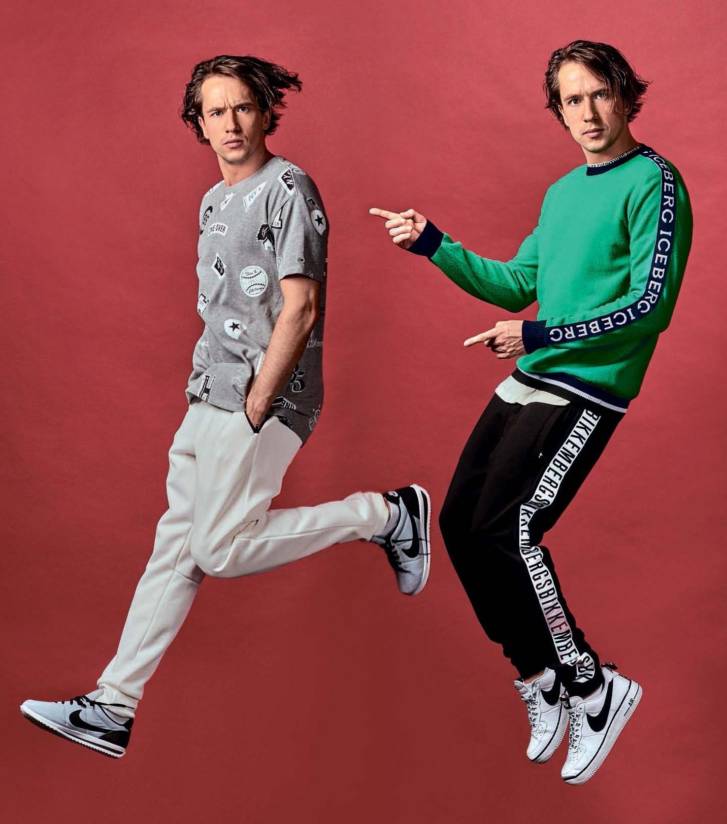 На фото слева: футболка, Tommy Hilfiger; спортивные брюки, Uniqlo; кроссовки, Nike Cortez На фото справа: джемпер, Ice Iceberg; футболка, H&M; спортивные брюки, Dirk Bikkembergs; кроссовки, Nike Air Force 1