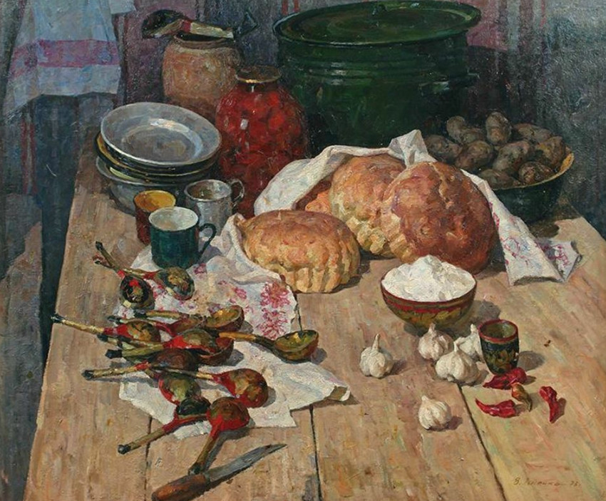 Также на стол обязательно ставили хлеб. Пекли его из ржаной муки один-два раза в неделю, без дрожжей. Если выдавался голодный год и зерна на хлеб не хватало, в муку добавляли лебеду. Если не было и этого сорняка, то приходилось толочь сосновую кору.