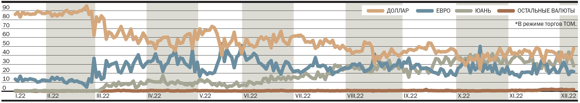 Данные о том, что внешнеторговые расчеты России к концу 2022 года уже наполовину осуществляются не в привычной валюте — долларе США и евро,— опубликованы в Обзоре финансовой стабильности Банка России за второй—третий кварталы 2022 года: после закрытия публикации Федеральной таможенной службой и ЦБ данных экспорта-импорта и платежного баланса (по итогам введения санкций, которые, в свою очередь, введены против РФ большей частью развитых стран в результате начала специальной военной операции РФ на Украине) альтернативных источников такого рода данных почти не осталось. В принципе, переход этого рубежа был предсказуем в ЦБ еще в сентябре — по итогам третьего квартала доля валют стран, вводивших против РФ санкции (в правительственных и президентских документах эти страны именуют «недружественными», в документах ЦБ используют в отношении таких валют термин в кавычках — «токсичные»), а именно евро и доллара, уже составляла 53%.