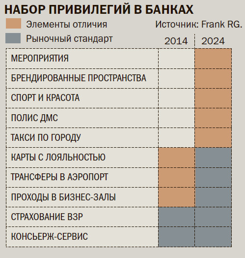 По сути, премиальное обслуживание отличается от обычного по двум параметрам — продукты и сервис. Так, премиальные клиенты получают улучшенные условия по тем же продуктам, которые доступны в том числе и массовым клиентам (повышенные ставки по вкладам и накопительным счетам, сниженные комиссии и увеличенные лимиты по переводам и платежам, повышенный кешбэк и лимит его начисления, льготные цены на покупку металлов и сниженная комиссия брокерского обслуживания и т. д.), а также дополнительные нефинансовые привилегии — проходы в бизнес-залы, компенсация походов в рестораны в аэропортах, трансферы и такси, страхование путешественников, консьерж-сервис, консультации (юридические и налоговые, медицинские, консультации по недвижимости и др.), спортивные привилегии и т. д. Также им могут быть доступны продукты, которые массовые клиенты приобрести не могут из-за высокого порога входа,— например, некоторые программы страхования жизни.