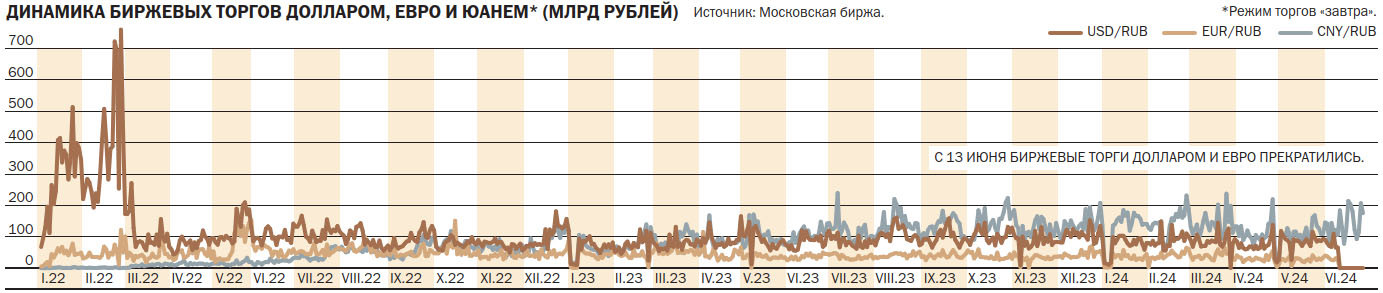 Первым шагом биржи на введенные ограничения стал запрет с 13 июня торгов долларом и евро, а также инструментами, в расчетах по которым используются эти валюты. В итоге все операции с ними были переведены на внебиржевой рынок. В свою очередь, Банк России пояснил механизмы расчета официального курса, который раньше считался по биржевым сделкам. Теперь в расчетах участвуют котировки внебиржевого рынка. Мосбиржа прекратила операции и с гонконгским долларом, но объемы торгов с ним упали еще осенью прошлого года и в последние месяцы не дотягивали до 1 млрд руб. в месяц. В то же время ликвидность в долларе и евро после падения в 2022–2023 годах в текущем году держалась возле 1,5–2 трлн руб. и 0,6–0,9 трлн руб. в месяц.
