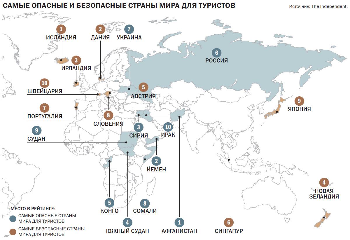 Выбор мест, которые российские путешественники сочли наиболее опасными для туризма, сильно отличается от выбора в общемировых опросах. К примеру, The Independent в своем исследовании в пятерку самых опасных для путешествий стран включает Афганистан, Йемен, Сирию, Южный Судан и Конго. Во второй пятерке — Россия, Украина, Сомали, Судан и Ирак.