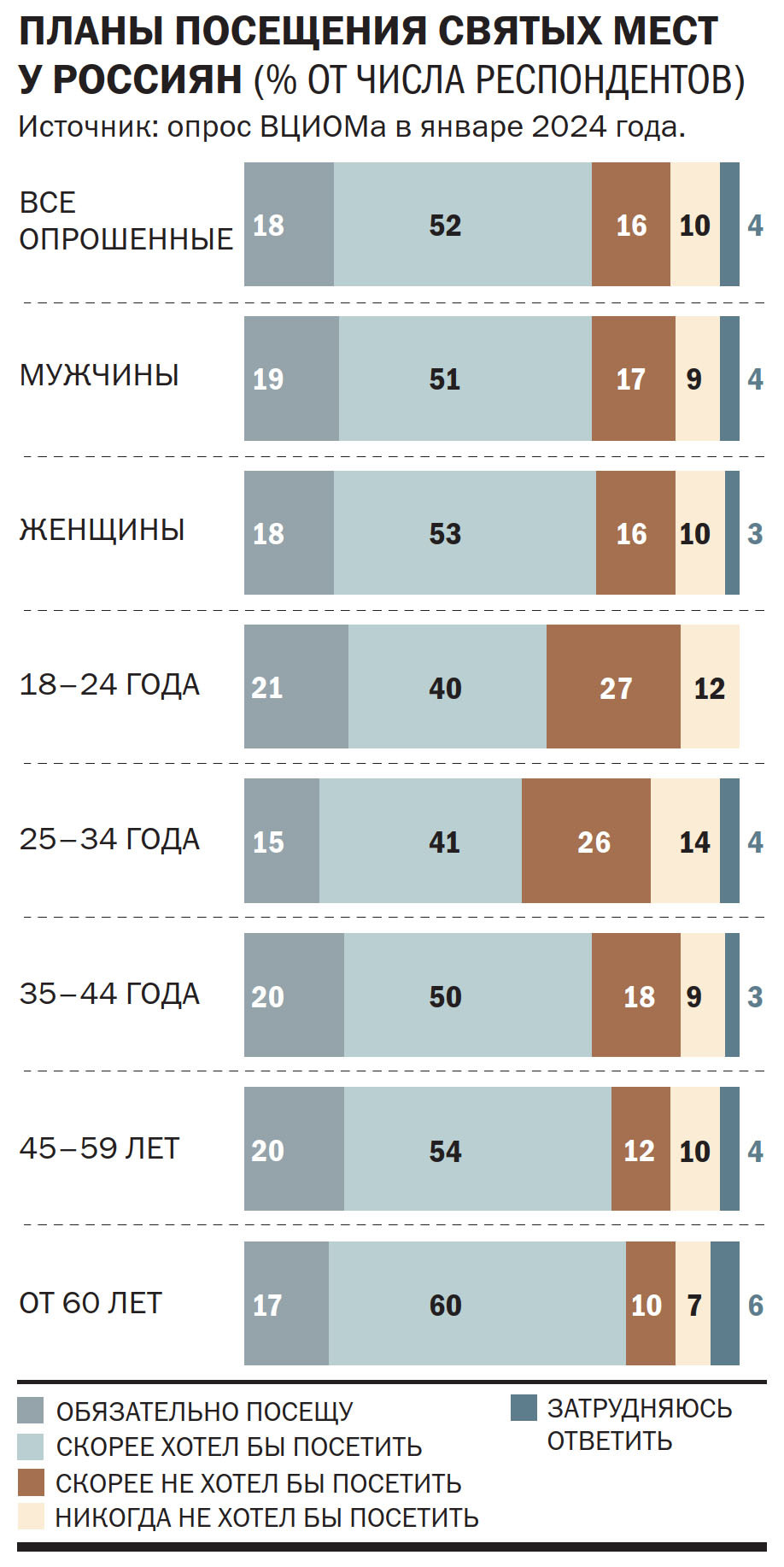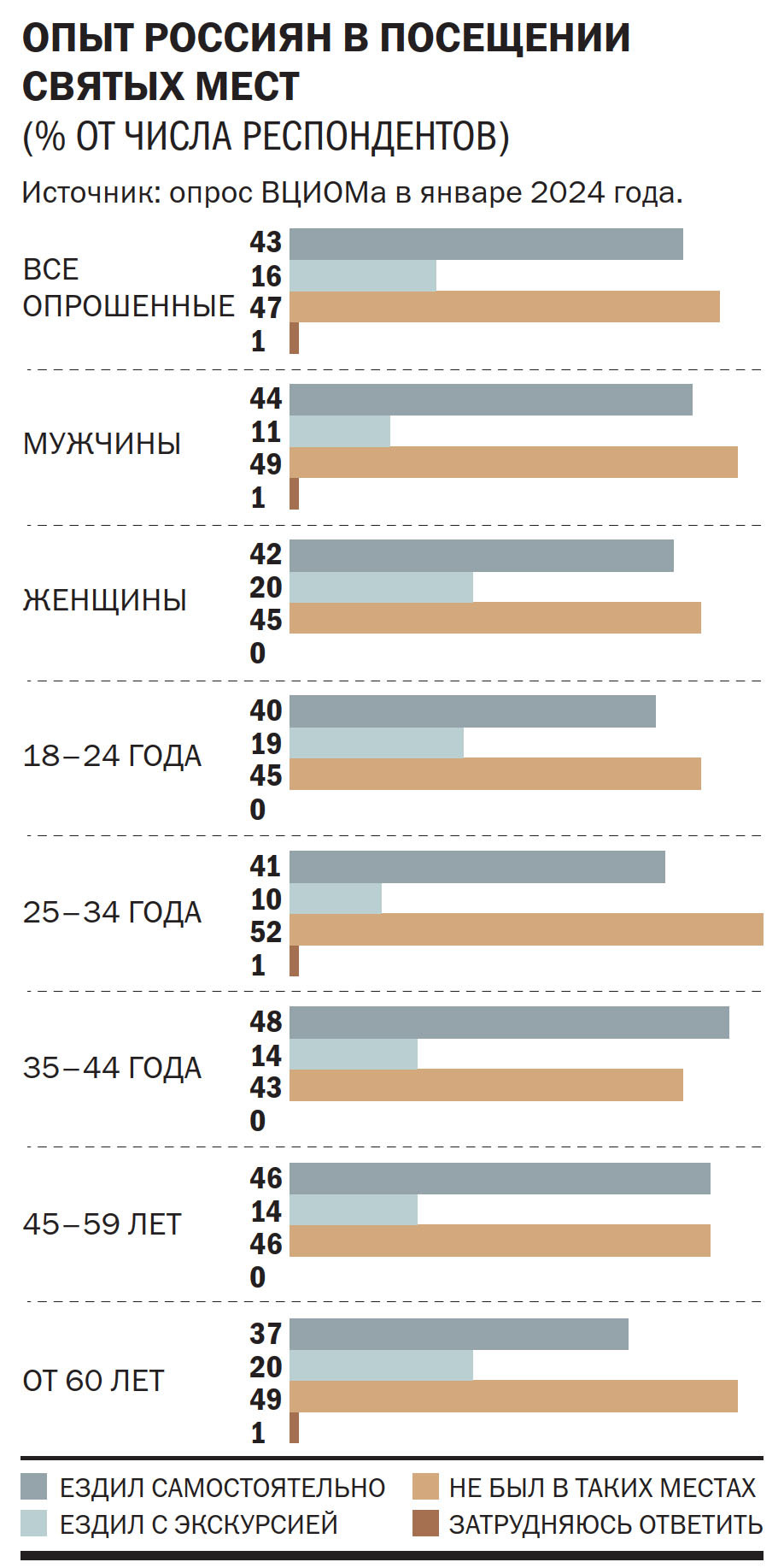 Паломнические поездки — популярное направление туризма. По опросам ВЦИОМа, проведенным в начале 2024 года, святые места в общей сложности посещали 43% россиян. Показатель постоянно растет: десять лет назад, в 2014 году, подобные поездки совершали лишь 26%, а в 2020 году — 31%. При этом 96% паломников остались довольны своим опытом, а 70% готовы совершать подобные поездки и в будущем. Рост популярности паломнических поездок аналитики ВЦИОМа объясняли бумом внутреннего туризма и ростом «интереса к ненаучным способам взаимодействия с миром».