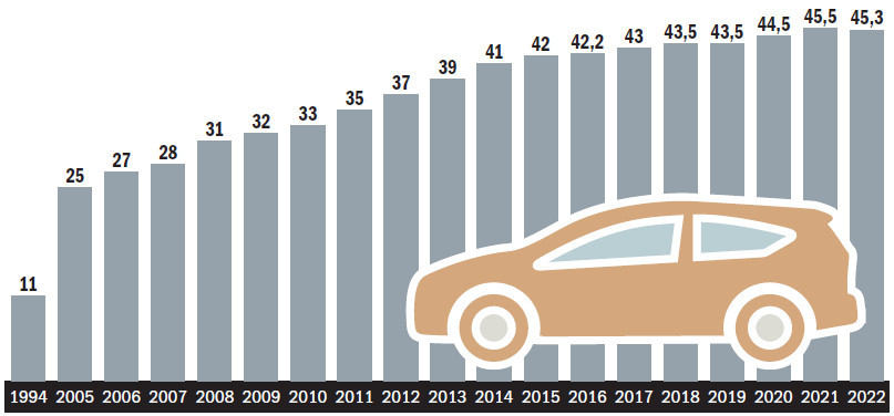 Вопреки экономическим турбулентностям и потрясениям последних лет численность автомобилей в России растет устойчивыми темпами. Разве что в ушедшем году прирост автопарка в стране слегка притормозил: по оценкам «Автостата», по состоянию на январь 2023 года в России было зарегистрировано 45,3 млн автомобилей. Это всего на 0,4% меньше, чем в январе 2022 года (45,5 млн). По сравнению с показателями десятилетней давности прирост числа машин в стране составил почти четверть, а если сопоставлять показатели 2005 года, то увеличение произошло двукратное.