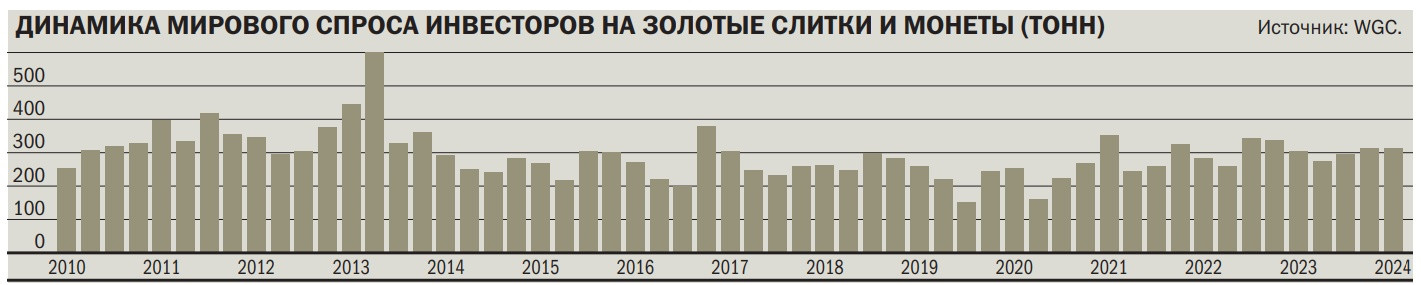 Растет интерес к физическому золоту и у россиян, о чем свидетельствуют данные WGC и опрос крупнейших банков журналом «Деньги». По данным Мирового совета по золоту, по итогам первого квартала покупки слитков и монет в России составили 7 тонн, что на 5% выше, чем в первом квартале 2023 года. По данным пресс-службы ВТБ, за первые четыре месяца 2024 года клиенты купили 6 тонн металла в виде золотых слитков. В Сбербанке физические лица приобрели 3 тонны, что на 13% больше, чем за аналогичный период прошлого года.