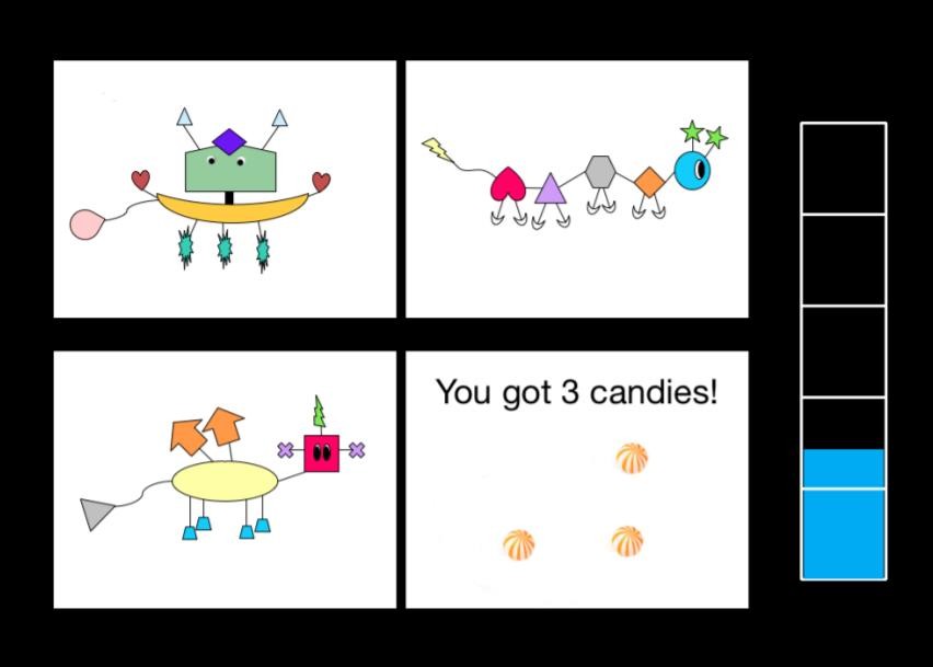 Натаниэль Бланко (Nathaniel Blanco) и Владимир Слуцкий (Vladimir Sloutsky) из Университета штата Огайо провели два эксперимента, в которых взрослым и детям приходилось делать выбор между использованием известной информации и исследованием новых возможностей. В первом исследовании участвовали 32 четырехлетних ребенка и 34 студента университета. На экране появлялись четыре «инопланетянина», за каждого давали определенное количество (одну, две, три или десять) виртуальных конфет, которые дети после эксперимента могли обменять на стикеры.