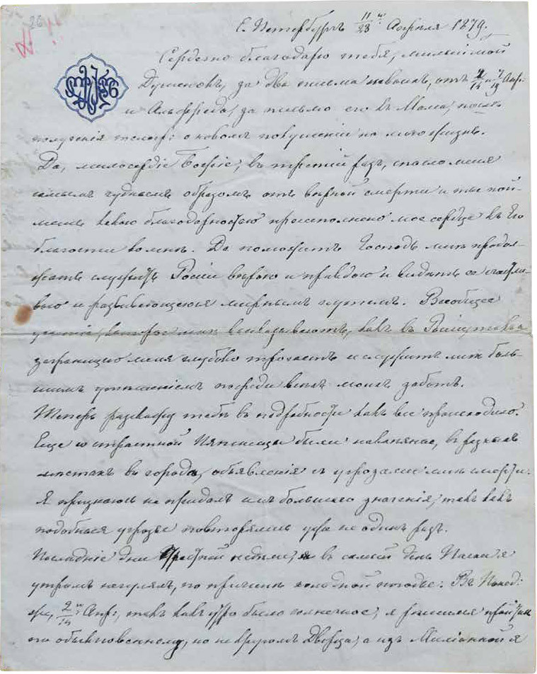 «С. Петербург 11/23го Апреля 1879. Сердечно благодарю тебя, милый мой Душенок1, за два письма твоих, от 2/14-го и 7/19 Апр. и Альфреда2, за письмо его к Мама3, после получения телегр. о новом покушении на мою жизнь. Да, милосердие Божие, в третий раз, спасло меня самым чудным образом от верной смерти и ты понимаешь, какою благодарностью преисполнено мое сердце к Его благости ко мне. Да поможет Господь мне продолжать служить России верою и правдою и видеть ее счастливою и развивающеюся мирным путем. Всеобщее участие, которое мне высказывают, как в России, так и за границею меня глубоко трогает и служит мне большим утешением посреди всех моих забот.