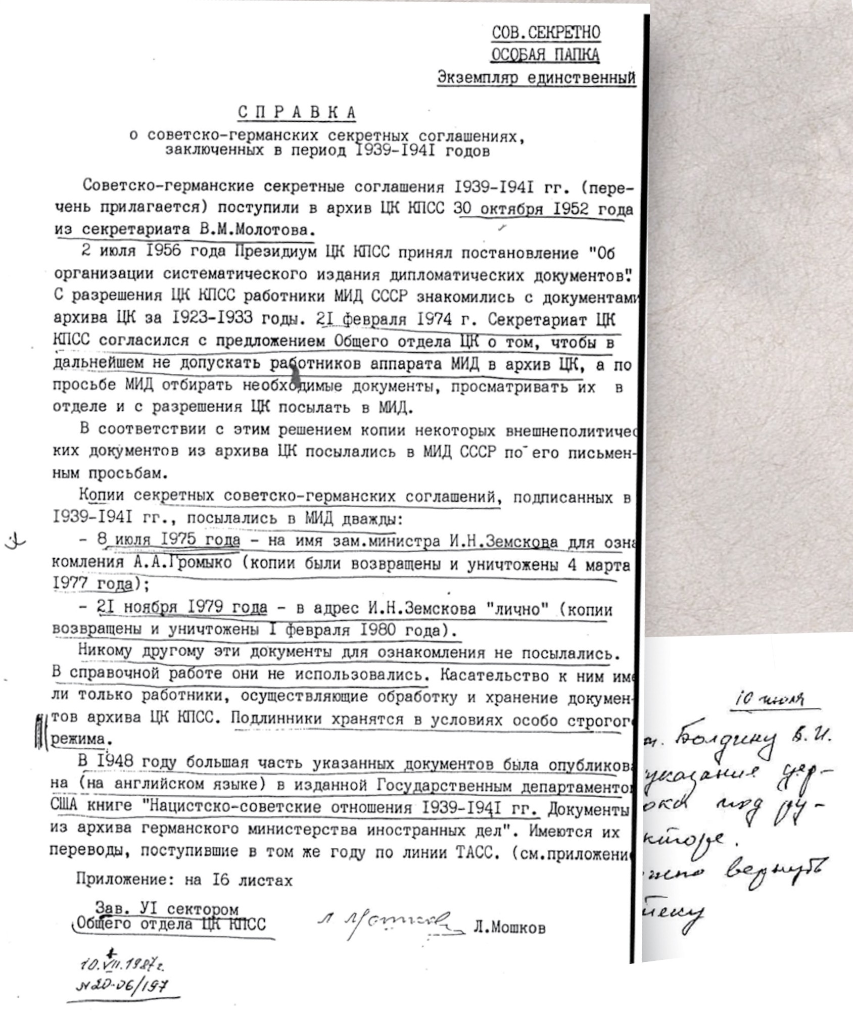 Представляем вниманию читателей материалы ЦК КПСС о хранении секретных документов по истории советско-германских соглашений 1939 и 1941 годов (из коллекции генерал-полковника Дмитрия Волкогонова).