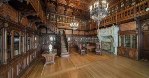 Большое, просторное помещение, обращённое окнами на Адмиралтейство, напоминает о библиотеках в средневековых замках и аббатствах. Кессонированный потолок, многочисленные встроенные книжные шкафы, кронштейны, балюстрады деревянной лестницы и обходной галереи второго яруса, двустворчатые двери изобилуют разнообразными мотивами резного готического орнамента — стрельчатыми арками, трилистниками и розетками. Отполированное воском ореховое дерево эффектно сочетается с красными с золотом тиснёными кожаными обоями, которыми затянуты свободные участки стен между книжными шкафами и хорами.