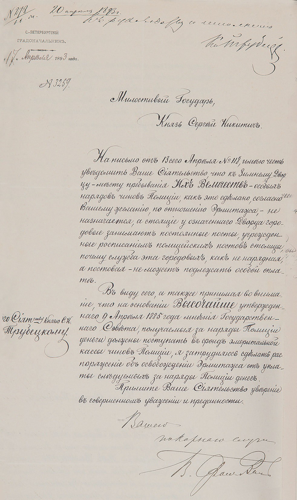 Градоначальник пошёл навстречу этой просьбе и «отдал приказание о назначении по воскресным и праздничным дням к Императорскому Эрмитажу наряда, в составе одного околоточного надзирателя», а со своей стороны попросил князя Трубецкого сделать распоряжение об уплате Эрмитажем за каждый наряд по три рубля. В следующем письме от 13 апреля Эрмитаж благодарил фон Валя за назначение наряда и просил освободить его «от уплаты денег за каждый наряд», ссылаясь на то, что у Зимнего дворца, места пребывания императора, стоят полицейские посты и Эрмитаж тоже является таким же местом.
