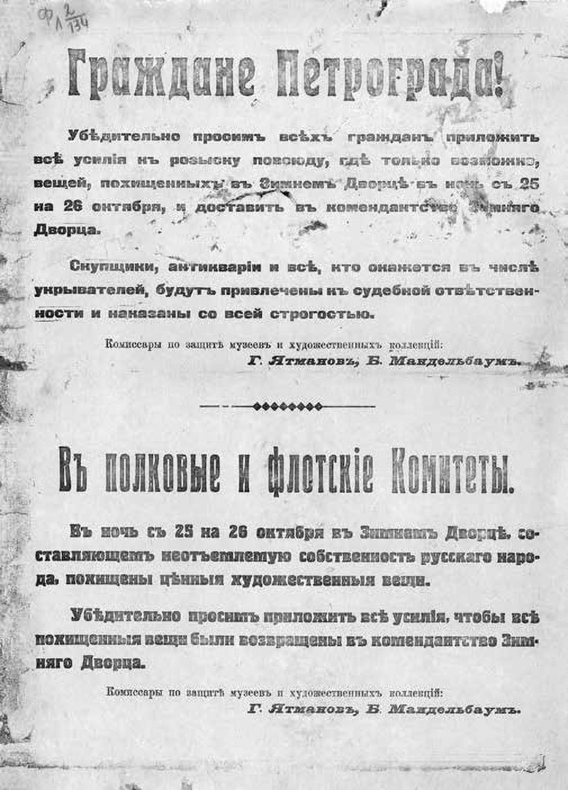 Убедительно просим всех граждан приложить все усилия к розыску повсюду, где только возможно, вещей, похищенных в Зимнем дворце в ночь с 25 на 26 октября, и доставить их в комендантство Зимнего дворца. Скупщики, антикварии и все, кто окажется в числе укрывателей, будут привлечены к судебной ответственности и наказаны со всей строгостью.