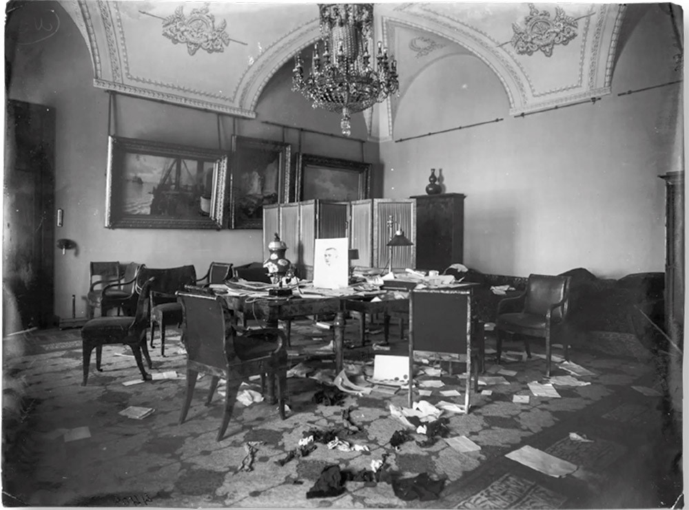 Двери комнаты Николая II «были самым варварским образом разбиты, причём двери закрыты на замок, так что, очевидно, одна партия грабителей спасалась от другой, закрывая двери, чтобы та не могла пройти в другие помещения». Покои свергнутого императора Николая II и императрицы Александры Фёдоровны вообще стали предметом особой ярости восставших. «Но все эти комнаты не представляют никакого интереса с художественной точки зрения. Они скорее антихудожественны, чем художественны. Но разгром там полный. Из кабинета Александры Фёдоровны пропал знаменитый портрет Николая II, написанный Серовым. Портрет этот был найден позднее в совершенно изорванном виде. Так что реставрировать его вряд ли возможно».