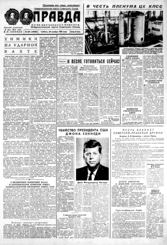 Суббота была рабочим днём, радио выдавало новость за новостью (это первая программа: «Маяк» появится только в следующем году), а недалеко от угла 4-й Мещанской, недавно ставшей просто Мещанской, и улицы Дурова висел газетный стенд. По дороге в школу мы с мамой успели увидеть большую фотографию убитого президента на первой полосе «Правды» и прочитать сообщение. К Джону Кеннеди относились в основном хорошо и даже трепетно. Ушла прошлогодняя тревога, связанная с Карибским кризисом, когда ядерная война реально приблизилась, а моего отца, офицера запаса ВМФ, проходившего военные сборы на Балтике, оставили «без берега» и посадили на противолодочный корабль. Так что мы волновались по-настоящему. Но, к счастью, эти дни осени 1962 года оказались всего лишь эпизодом, хоть и страшным. Договорились. Роль Кеннеди в разрешении конфликта официально не педалировалась, но по духу сообщений было ясно, что и там, наверху, снова потеплело.