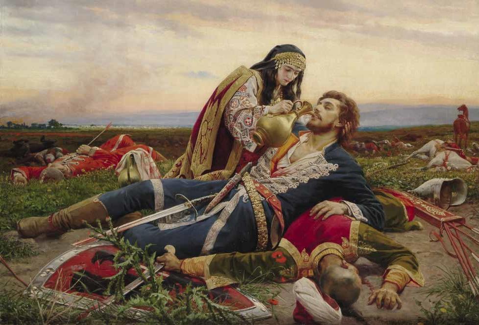 Самая известная картина сербского художника-реалиста Уроша Предича посвящена знаменитой битве на Косовом поле, которая произошла 15 июня 1389 года. К тому времени развернулась борьба за господство на Балканах. Османская империя продолжала укреплять свою мощь, а Византия теряла влияние. Сербское королевство было, пожалуй, единственным, кто мог оказать туркам сопротивление. Несмотря на поражение в этом сражении, сербам удалось остановить захватчиков. Возможно, помогла хитрость сербского вельможи Милоша Обилича, который обманом пробрался в турецкий лагерь и заколол кинжалом османского правителя Мурада I. Но отстоять свой суверенитет сербы не смогли. В бою погиб последний независимый правитель государства князь Лазарь. Вскоре после сражения сербы уже помогали турецкому султану бороться с крестоносцами и бывшими союзниками.