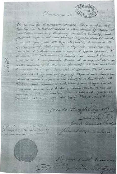 Это противоречие разъяснил найденный мной в Российском государственном военно-историческом архиве аттестат, выданный старшему брату Михаилу Чаадаеву после завершения обучения 31 мая 1811 года. В нём точно указано, что он, а значит, и его младший брат Пётр, поступил в университет 9 марта 1808 года. Список же, напечатанный в газете 4 июля, просто перечислял всех студентов, принятых ранее в течение года. Поздние же исследователи по ошибке сочли его распорядительным актом о зачислении студентов.