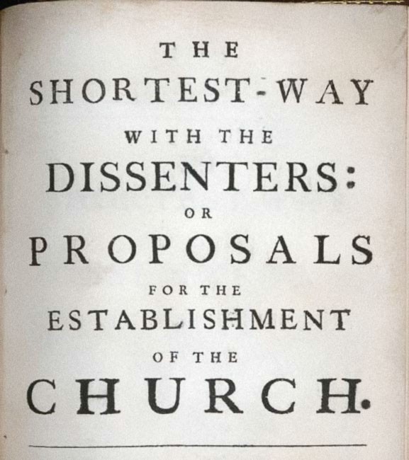 В конце 1702 года появился и начал ходить по рукам (соцсети XVIII века) безымянный памфлет «Простейший способ разделаться с диссидентами». Начинался он с пересказа притчи: «Случилось как-то Петуху попасть в конюшню к Лошадям, и, не увидев ни насеста, ни иного удобного пристанища, он принуждён был разместиться на полу. Страшась за свою жизнь, ибо над ним брыкались и переступали Лошади, он принялся их урезонивать с большой серьёзностью: "Прошу вас, джентльмены, давайте стоять смирно, в противном случае мы можем растоптать друг друга!"…»