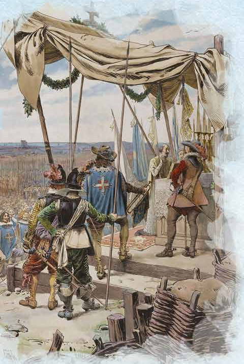 В 1622 году король Людовик выделяет пятьдесят человек из подразделения конных карабинеров, набранного ещё его отцом, Генрихом IV, и вооружает их длинноствольными мушкетами вместо карабинов. Получается элитная рота конной пехоты, мушкетёры. Лишённые возможности стрелять на скаку, они могли очень быстро перемещаться и, спешившись, вести довольно беглый огонь. Мушкет, по сравнению со старой аркебузой, гораздо более совершенное оружие, но всё равно, перезаряжать его было долго и сложно, а прицельно стрелять — только поставив на сошку. Пересмотрите «Трёх мушкетёров»