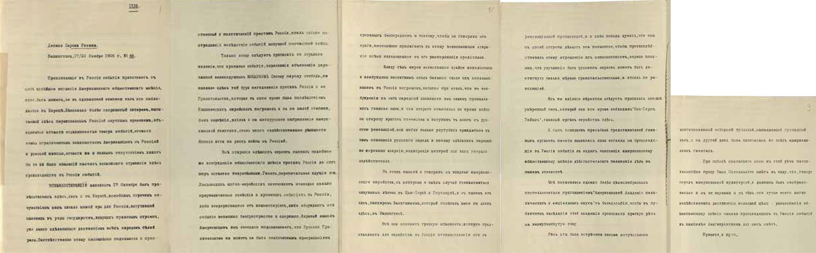 Депеша, направленная из Вашингтона русским послом в США Романом Розеном 17 (30) ноября 1905 года, информировала Петербург о взглядах американской публики на Россию.