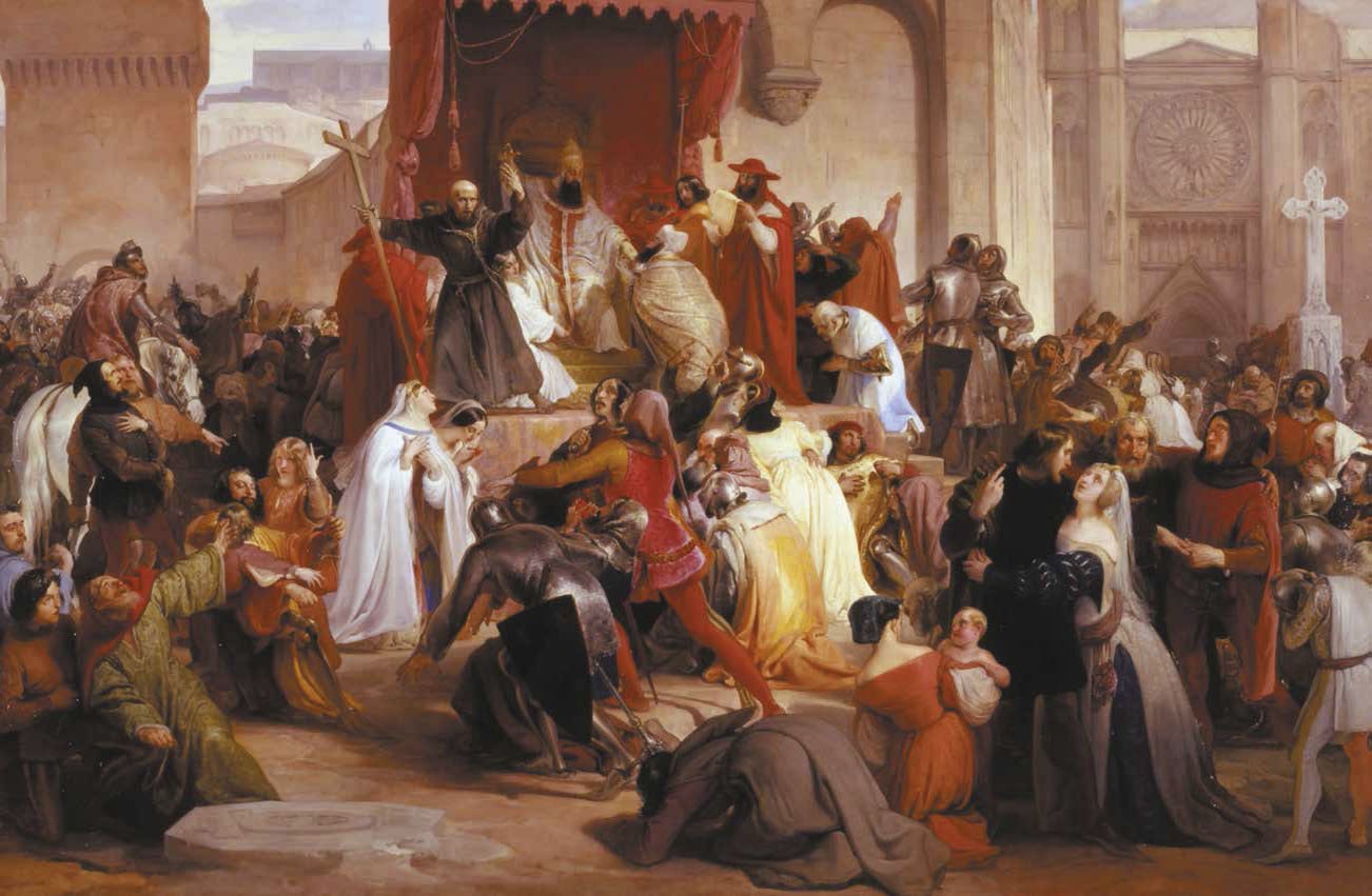 Началом крестовых походов принято считать Клермонский собор. В 1095 году после общения с византийскими послами папа Урбан II созвал духовенство и рыцарство и произнёс речь: «Земля, которую вы населяете, сделалась тесной при вашей многочисленности. Богатствами она не обильна и едва даёт хлеб тем, кто её обрабатывает. Отсюда происходит то, что вы друг друга кусаете и друг с другом сражаетесь. Теперь же может прекратиться ваша ненависть и смолкнет вражда. Предпримите путь ко гробу святому, исторгните ту землю у нечестивого народа и подчините её себе. Кто здесь горестен и беден, там будет богат».