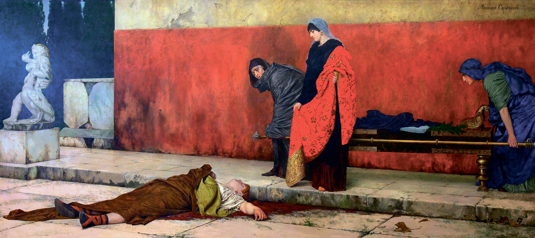 Русский художник Василий Сергеевич Смирнов (1858–1890), ориентировавшийся в своём творчестве на античные сюжеты, работал над полотном «Смерть Нерона» в Италии в течение нескольких лет и представил его в качестве отчёта перед Академией художеств, оплатившей эту поездку. Картина масштабна — ширина четыре метра. Академики этой работой восхищались, позже её оценил и император Александр III, который приобрёл картину в свою коллекцию. В 1889 году художник, ставший академиком после «Смерти Нерона», жил и работал в России, но недолго: чахотка вынудила его вернуться в тёплую Италию. Это продлило его жизнь всего на год.