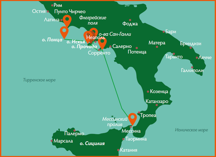 Отправиться в Аид, чтобы узнать у духа прорицателя Тиресия путь домой, царю Итаки велела Цирцея. Она же попросила Борея, северный ветер, донести корабль грека до входа в мир мёртвых. Это значит, что греки поплыли на юг. Согласно нашим предположениям, островом Эя, где жила колдунья, можно считать Понцу или соседний Пунто Чирчео (см. предыдущий номер «Дилетанта»). Если оттуда идти на юг (северный ветер будет попутным), то как раз часов за 12–16 можно добраться до Флегрейских полей. Это полностью соотносится с описанным маршрутом у Гомера. Более того, чтобы дальше продолжать двигаться на Итаку, нужно пройти Мессинский пролив — предполагаемую Сциллу и Харибду. Так что географически это место нам полностью подходило.