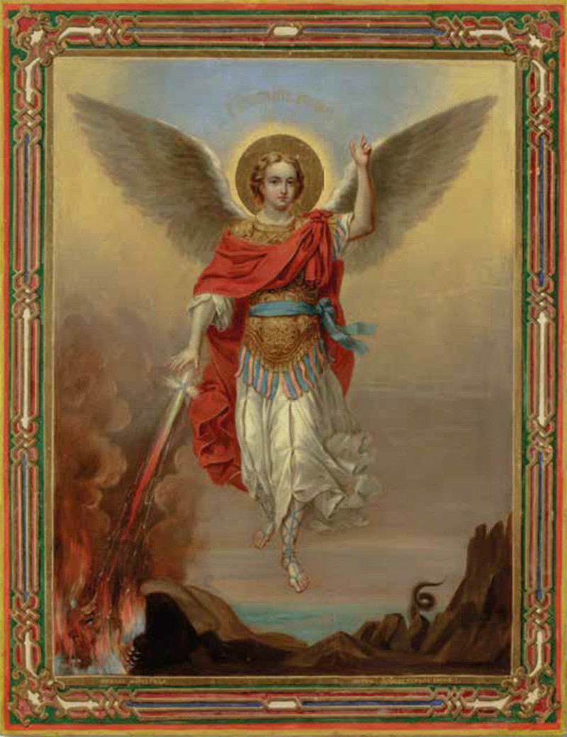 Широкое распространение в придворной среде образа Архангела Михаила прослеживается с древних времён и определено многогранностью его почитания. Архистратиг является первым среди других архангелов предводителем небесного воинства, победителем «дракона, змия древнего, который есть дьявол и сатана». Поэтому на иконах архангел Михаил часто изображается в доспехах и с обнажённым копьём или мечом (иногда — огненным, заимствованным русскими мастерами из западноевропейских образцов), которым он повергает дракона или дьявола. Святой также выступает покровителем христианских правителей, полководцев, защитником человеческих душ (в том числе и в потусторонней жизни) — не случайно государевой усыпальницей служил Архангельский собор Московского Кремля.
