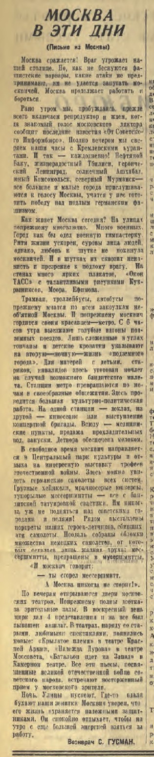 Получив медикаменты, отец отправился в старое здание ТАСС, которое существует и поныне. В ТАСС работал его друг, впоследствии достаточно известный детский писатель Герцель Новогрудский. Отец пришёл к нему и спросил, есть ли прямая связь с местным отделением в Баку. Узнав, что она есть, он попросил передать через ТАСС заметку в газету «Бакинский рабочий», старейшее коммунистическое издание Закавказья, на тот момент главную газету ЦК компартии Азербайджана, в которой он, кстати, ещё в 20-х годах подрабатывал ночным редактором. Отец передал в «Бакинский рабочий» заметку «Москва в эти дни», и в тот же день 1 ноября она была опубликована. Для него это было очень важно, потому что ходило очень много слухов по всему Союзу: будто Сталин бежал из Москвы, столица под немцами, она голодает и т. д. Но Москва стойко защищалась и жила достойной жизнью. Отец рассказал в заметке, что работали театры, ходили трамваи, что Москва не сдаётся. Тем самым он решил две задачи: с одной стороны, бакинцы узнали правду от человека, которому они доверяли и которого хорошо знали. Ведь подпись была — «Врач Соломон Гусман». А его родители — мои бабушка и дедушка, а также его жена, моя мама, узнали о том, что он жив-здоров.