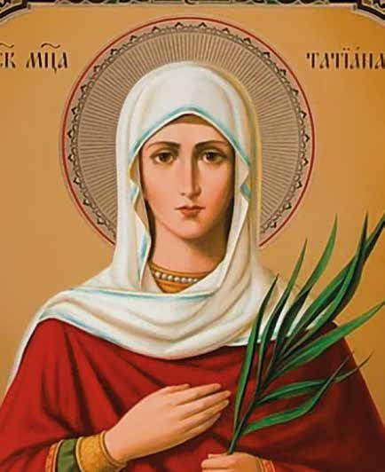 Сама Татиана была великомученицей. Дочь римского богача, будущая святая от отца приняла христианство, подвергавшееся в III веке н. э. жестоким гонениям. Схваченная римскими властями Татиана подверглась жестоким пыткам — её заставляли вознести молитву в храме Аполлона. Однако глубоко верующая христианка Татиана не сдалась мучителям. Она вознесла молитву Христу. И статуя Аполлона вместе с частью храма рухнула, завалив под своими обломками собравшихся в нём людей. Татиану пытали ещё несколько дней — в том числе травили львами. Но ничто не могло поколебать её веру. В итоге Татиану казнили.