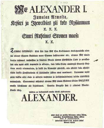 Государевой грамотой, данной жителям Суоми в Борго (Порвоо) 15 (27) марта 1809 года, император признал «за благо сим вновь утвердить и удостоверить религию, коренные законы, права и преимущества, коими каждое состояние (сословие. — К. А.) сего княжества в особенности, и все подданные, оное населяющие, от мала до велика по конституциям (прежним установлениям. — К. А.) их доселе пользовались, обещая хранить оные в ненарушимой их силе и действии». Александр I разрешил устройство сословно-совещательного собрания сословий, состоявшегося в 1809 году в Борго, создал Правительствующий Совет в качестве особого правительства, формировавшегося из «коренных финляндцев» и получившего семь лет спустя название Императорского Финляндского Сената.