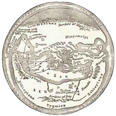 Как представляли греки времён Одиссея (XII век до н. э.) и времён Гомера (VIII век до н. э.) карту мира? Центр — это Дельфы, где встретились орлы Зевса, которых он выпустил с разных сторон ойкумены. Восток ограничивался Левантом, а запад — Сицилией и Сардинией. Земля, по мнению греков, была плоской, а вокруг неё текла река Океан. Гелиос, бог солнца, каждый день летел по небу, приземлялся на западе и за ночь по реке Океан оплывал весь мир, чтобы утром снова оказаться на востоке.