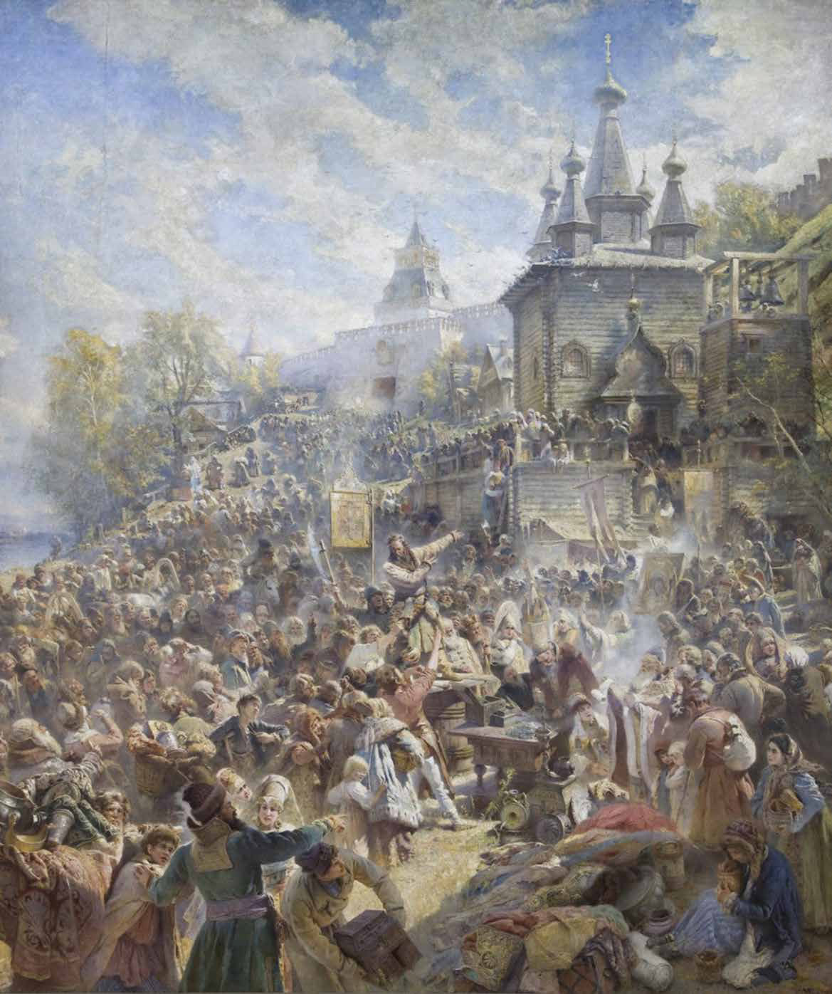 Картину, изображавшую воззвание Минина, Константин Маковский задумал в 1870-х годах и 20 лет вынашивал эту идею. Сам процесс создания полотна занял около шести лет активной работы и завершился в 1896 году. Сейчас оно считается самым масштабным произведением русской станковой живописи. Картина «Минин на площади Нижнего Новгорода, призывающий народ к пожертвованиям» (так звучит полное авторское название) размером 6 на 7 метров выставляется в Нижнем Новгороде в специально выстроенном